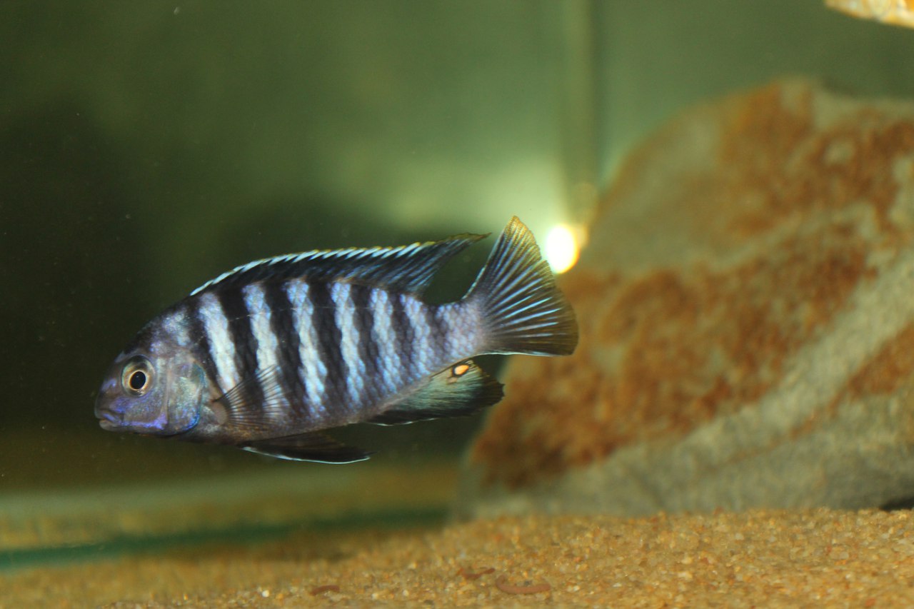 Интересная малавийская цихлида из группы трофеопсов . Вырастает до 12 см . Содержать лучше группами от 10 ти особей в аквариуме от 300 литров с соразмерными цихлидами группы мбуна . Питание циклоп ,артемия ,сухие корма со спирулиной , овощи ,самодельные фарши .